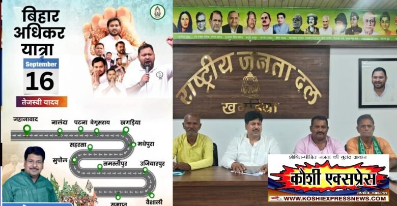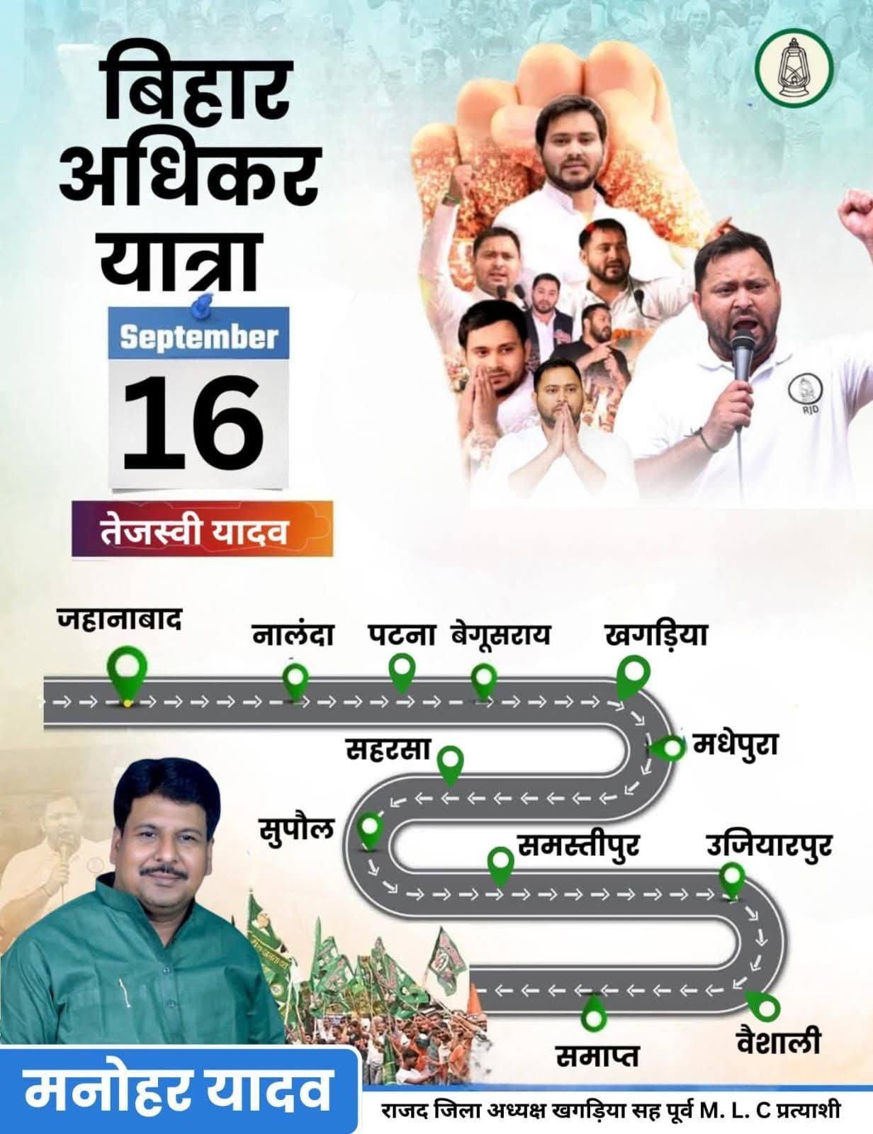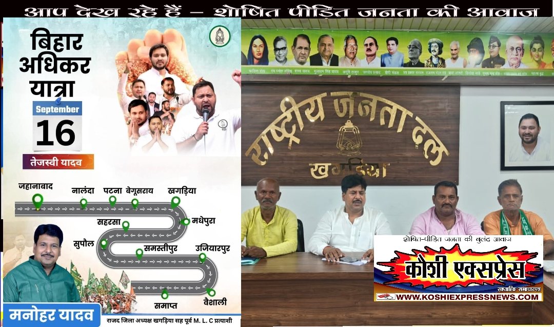 खगड़िया/ कौशी एक्सप्रेस/आज दिनांक-16 सितम्बर 2025 को कृष्णापुरी बलुआही स्थित जिला राष्ट्रीय जनता दल कार्यालय खगड़िया में पूर्व एमएलसी प्रत्याशी सह राजद जिलाध्यक्ष मनोहर कुमार यादव ने प्रेस कॉन्फ्रेंस कर कहा कि राष्ट्रीय जनता दल द्वारा नेता प्रतिपक्ष तेजस्वी प्रसाद यादव के नेतृत्व में आज दिनांक-16 सितंबर 2025 से ” बिहार अधिकार यात्रा” कार्यक्रम चल रहा है।