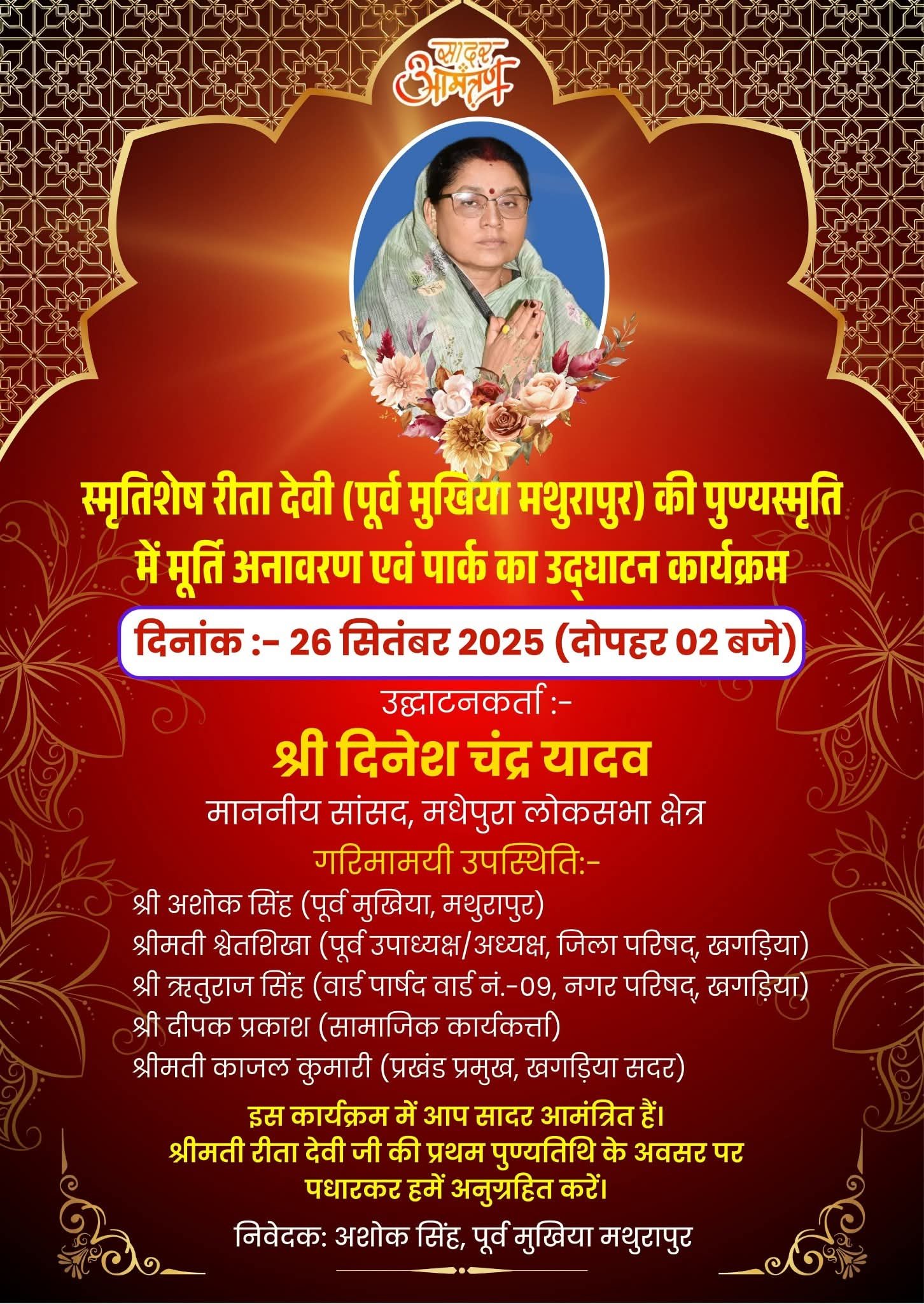 कार्यक्रम की जानकारी देते हुए स्व. रीता देवी के पति एवं जदयू नेता अशोक सिंह (पूर्व मुखिया, मथुरापुर) ने बताया कि रीता देवी हमेशा समाज सेवा और ग्रामीण विकास के लिए समर्पित रहीं। उनकी स्मृति को चिरस्थायी बनाने के लिए यह मूर्ति और पार्क आने वाली पीढ़ियों को प्रेरित करेगा। मैं सभी क्षेत्रवासियों और शुभचिंतकों से अपील करता हूं कि वे अधिक से अधिक संख्या में शामिल होकर उन्हें श्रद्धांजलि अर्पित करें। बताया जाता है कि कार्यक्रम में कई विशिष्ट अतिथि शामिल होंगे, जिनमें श्रीमती श्वेता शिखा (पूर्व उपाध्यक्ष/अध्यक्ष, जिला परिषद, खगड़िया) श्री ऋतुराज सिंह (वार्ड पार्षद, वार्ड संख्या-09, नगर परिषद, खगड़िया), दीपक प्रकाश (सामाजिक कार्यकर्ता)श्रीमती काजल कुमारी (प्रखंड प्रमुख, खगड़िया सदर) एवं अन्य गणमान्य लोग उपस्थित रहेंगे। इस मौके पर बड़ी संख्या में ग्रामीणों, जनप्रतिनिधियों और सामाजिक कार्यकर्ताओं की उपस्थिति अपेक्षित है।