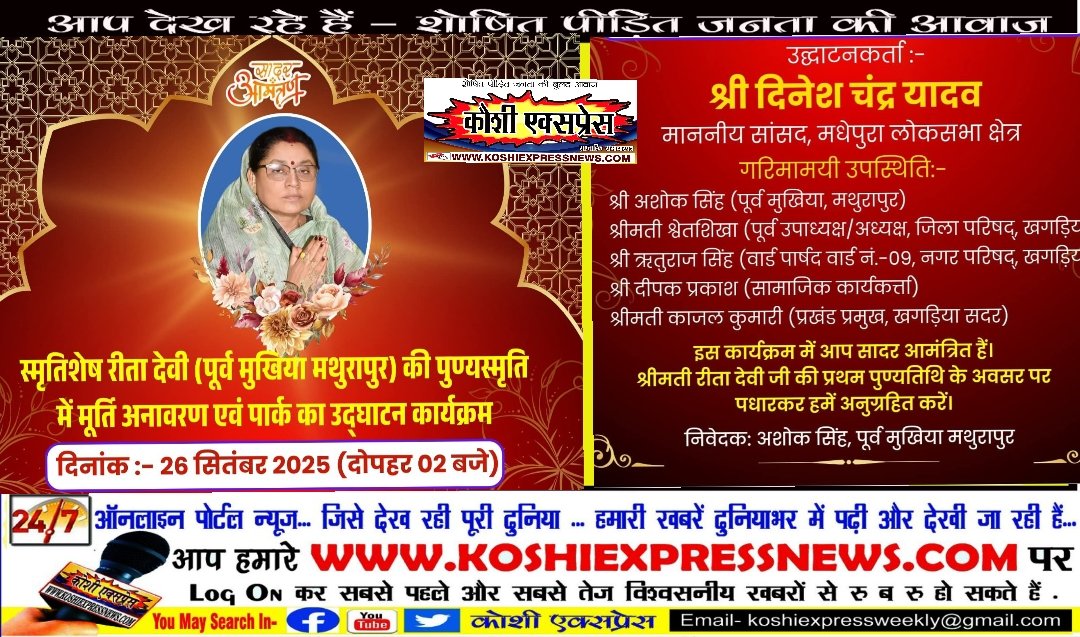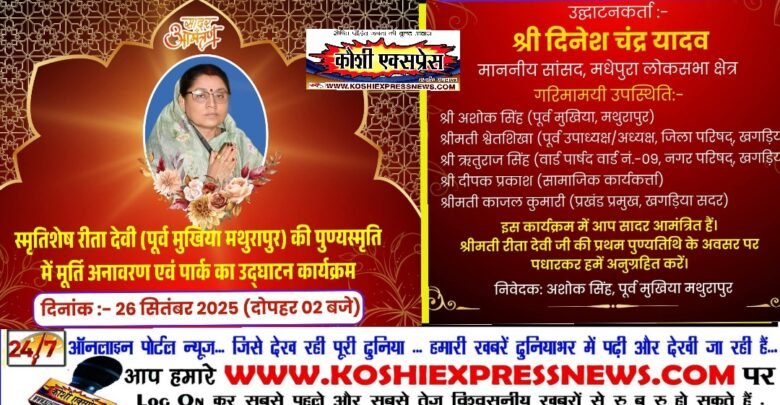 खगड़िया/ कौशी एक्सप्रेस/ मथुरापुर पंचायत की पूर्व मुखिया और लोकप्रिय जनप्रतिनिधि स्मृतिशेष रीता देवी की पुण्यतिथि पर विशेष कार्यक्रम आयोजित किया जा रहा है। इस अवसर पर मूर्ति अनावरण एवं पार्क का उद्घाटन आगामी 26 सितम्बर 2025 (दोपहर 2 बजे) मथुरापुर में किया जाएगा। मालूम हो कि इस भव्य कार्यक्रम का शुभारंभ मधेपुरा लोकसभा क्षेत्र के माननीय सांसद श्री दिनेश चंद्र यादव द्वारा किया जाएगा।