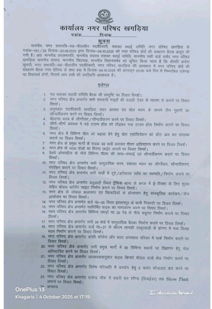 खगड़िया/ कौशी एक्सप्रेस/ शनिवार को नगर परिषद खगड़िया के सभागार में साधारण बोर्ड बैठक संपन्न हुई। बैठक की अध्यक्षता नगर सभापति-सह-पीठासीन पदाधिकारी श्रीमति अर्चना कुमारी ने की। बैठक में शहर के विकास एवं सौंदर्यीकरण से जुड़े कई महत्वपूर्ण प्रस्ताव पारित किए गए। जिसमें नगर क्षेत्र के सरकारी गड्ढों की उड़ाही टेंडर के माध्यम से कराने पर विचार किया गया। एवं अनुमंडल पदाधिकारी आवास एवं खेल भवन के सामने तीन मुहानी का सौंदर्यीकरण, के.एन. क्लब का जीर्णोद्धार एवं नया टाउन हॉल निर्माण, प्रमुख मार्गों पर पीलर अधिष्ठापन और 1000 पोलों पर तिरंगा लाइट लगाने का कार्य, रेलवे ओवरब्रिज के नीचे पीलरों की साफ-सफाई व सौंदर्यीकरण का कार्य, सभी सामुदायिक भवनों व पंचायत भवनों का जीर्णोद्धार व रंग-रोगन का कार्य, श्रीराम जानकी ठाकुरबाड़ी (वार्ड 27) परिसर में विवाह भवन निर्माण का कार्य, कोशी कॉलेज व सदर अस्पताल परिसर में पार्क निर्माण का कार्य, शहर की नवनिर्मित सड़कों का नामकरण के साथ-साथ ई-रिक्शा चार्जिंग प्वाइंट, शो प्लांट, यात्री शेड और चलंत शौचालय का निर्माण कार्य पर विशेष चर्चा की गई।