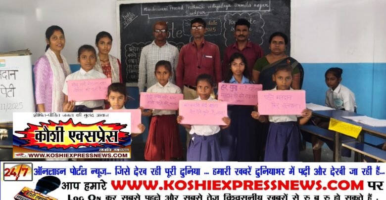 मानसी (खगड़िया)/ कौशी एक्सप्रेस/ बिहार विधानसभा चुनाव 2025 के मद्देनज़र मतदाताओं को जागरूक करने के उद्देश्य से नंदेश्वरी प्रसाद प्राथमिक विद्यालय, उर्मिला नगर सैदपुर (मानसी) में बीते सोमवार को मतदाता जागरूकता अभियान का आयोजन किया गया। जिला प्रशासन के निर्देशन में आयोजित इस कार्यक्रम का मुख्य लक्ष्य आगामी चुनाव में शत-प्रतिशत मतदान सुनिश्चित करना था। अभियान की विशेषता यह रही कि जागरूकता की जिम्मेदारी विद्यार्थियों ने अपने हाथों में ली।