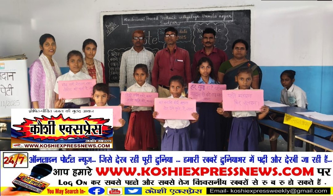 मानसी (खगड़िया)/ कौशी एक्सप्रेस/ बिहार विधानसभा चुनाव 2025 के मद्देनज़र मतदाताओं को जागरूक करने के उद्देश्य से नंदेश्वरी प्रसाद प्राथमिक विद्यालय, उर्मिला नगर सैदपुर (मानसी) में बीते सोमवार को मतदाता जागरूकता अभियान का आयोजन किया गया। जिला प्रशासन के निर्देशन में आयोजित इस कार्यक्रम का मुख्य लक्ष्य आगामी चुनाव में शत-प्रतिशत मतदान सुनिश्चित करना था। अभियान की विशेषता यह रही कि जागरूकता की जिम्मेदारी विद्यार्थियों ने अपने हाथों में ली।