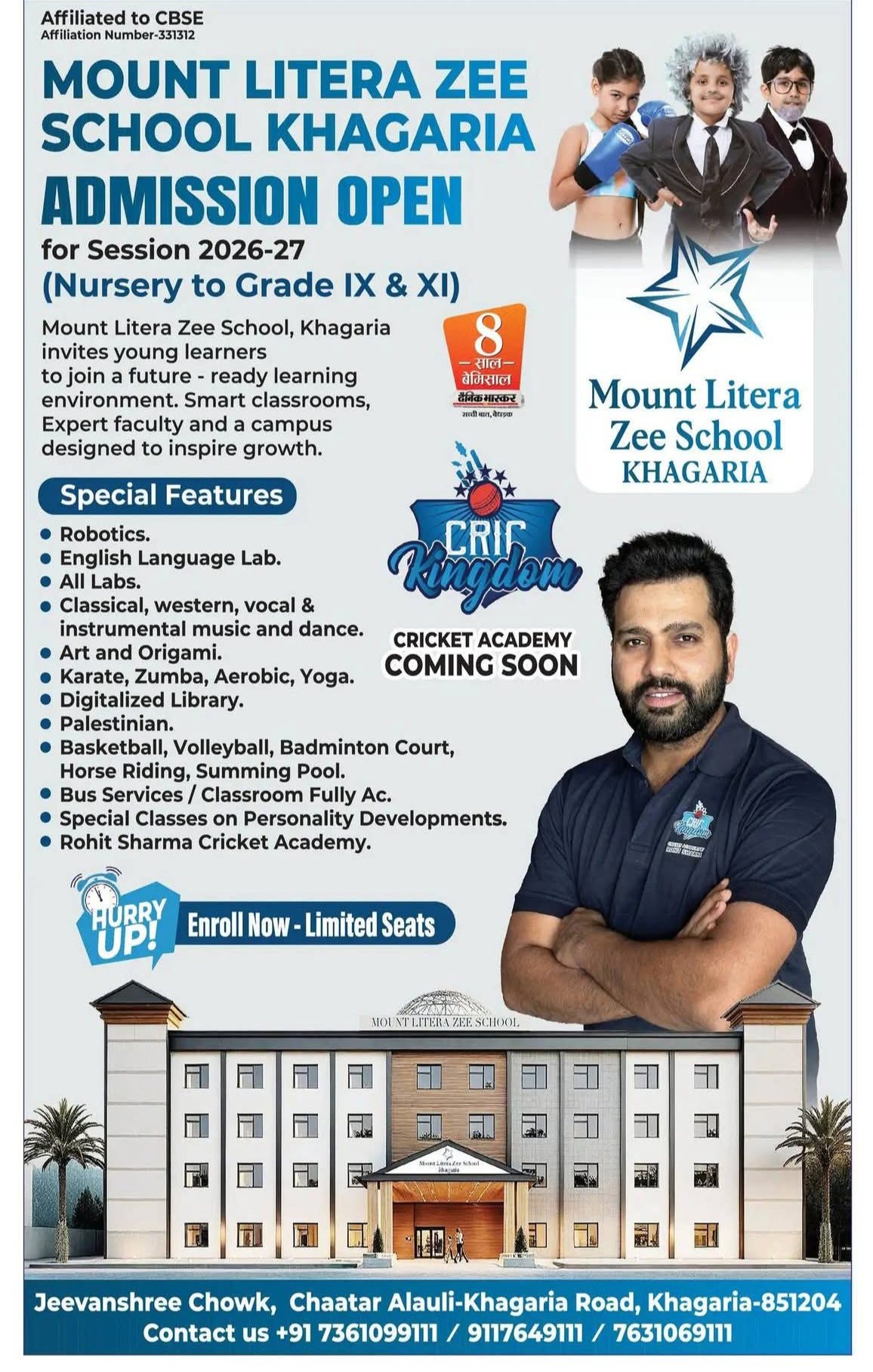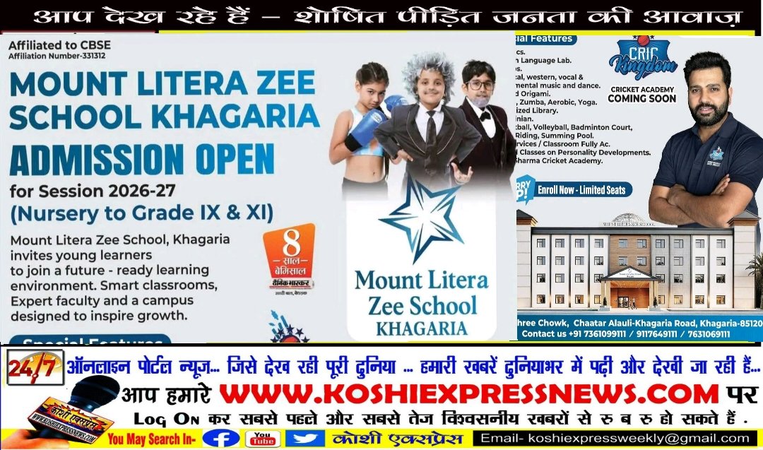 खगड़िया/ कौशी एक्सप्रेस/ प्राप्त सूचनानुसार जीवनश्री चौक, चातर अलौली–खगड़िया रोड स्थित लब्ध-प्रतिष्ठित शिक्षण संस्थान माउंट लिट्रा ज़ी स्कूल, खगड़िया ने सत्र 2026–27 के लिए नर्सरी से कक्षा IX एवं XI तक के नामांकन की प्रक्रिया प्रारंभ कर दी है। जिले में अपनी उत्कृष्ट शिक्षा व्यवस्था के लिए पहचाना जाने वाला यह संस्थान, भारत के प्रमुख शैक्षणिक नेटवर्क Mount Litera Zee School Network” का हिस्सा है, जिसके देशभर में सैकड़ों स्कूल संचालित हैं और जो आधुनिक व भविष्य-उन्मुख शिक्षा पद्धति के लिए प्रसिद्ध है।