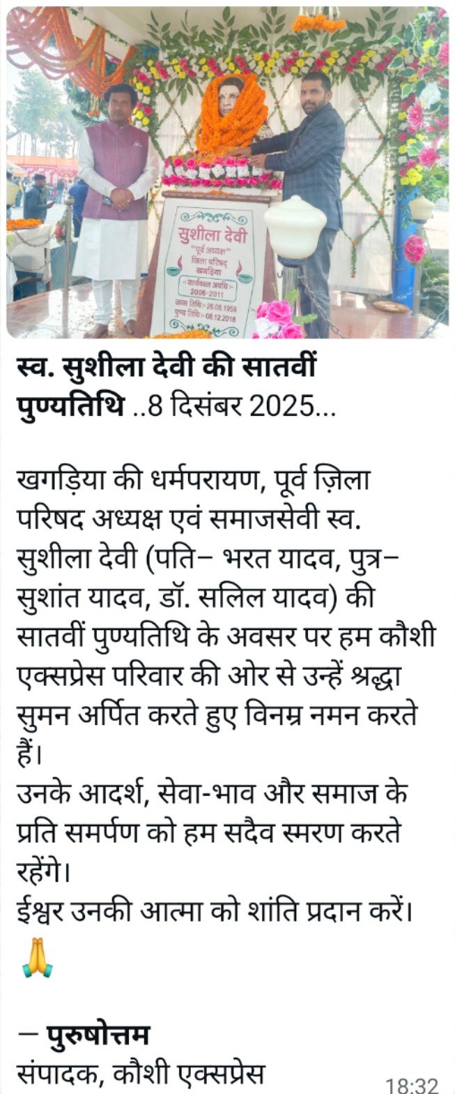 खगड़िया/कौशी एक्सप्रेस/ भरत नगर चुकती, मानसी स्थित एनएच-31 के मां कात्यायनी एचपी पेट्रोल पंप परिसर में रविवार को पूर्व सांसद श्रद्धेय रामशरण यादव की पुत्रवधू एवं जिले की प्रख्यात जननेता स्वर्गीय सुशीला देवी की सातवीं पुण्यतिथि बड़ी श्रद्धा, गरिमा और स्मृतियों के सौम्य वातावरण के बीच आयोजित की गई।