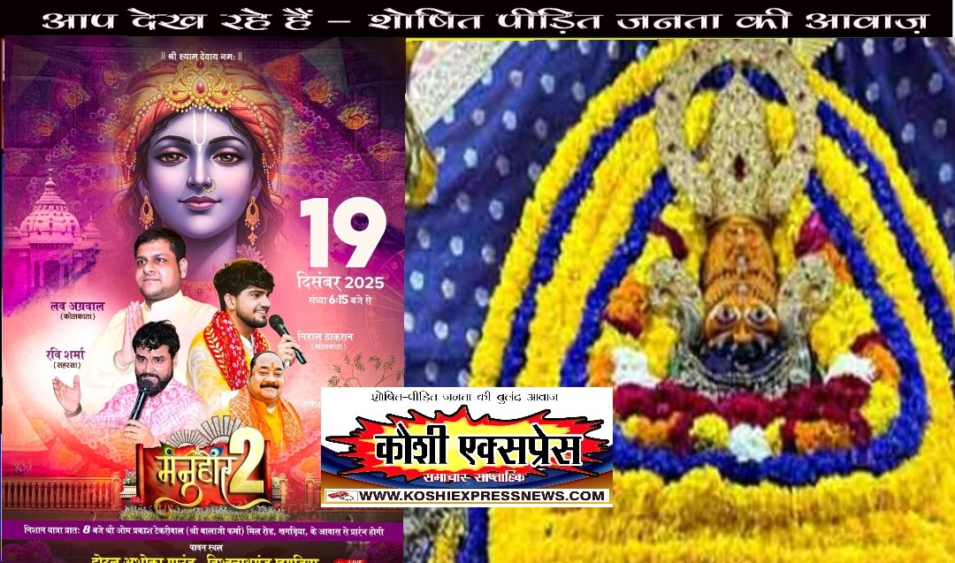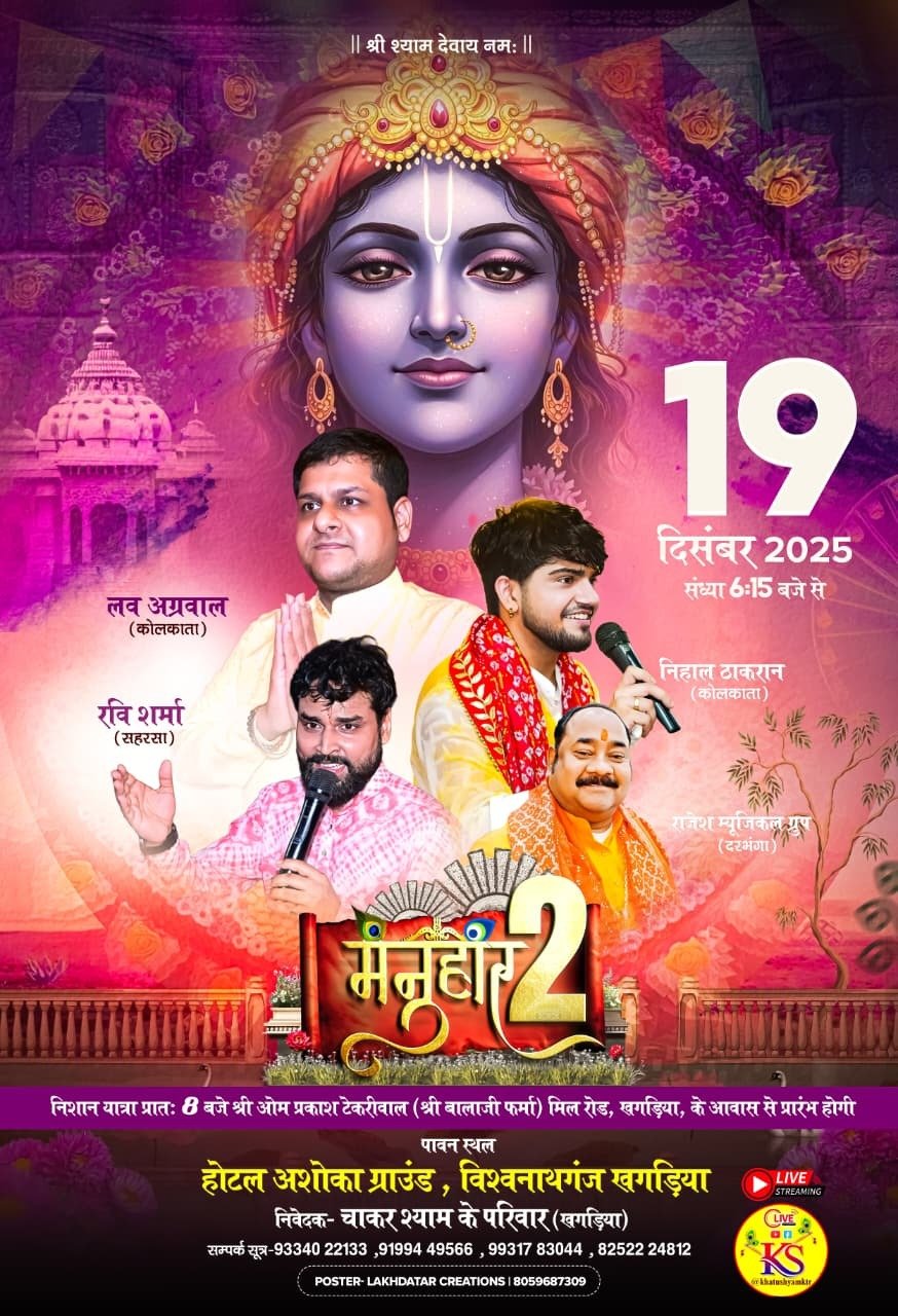 खगड़िया/ कौशी एक्सप्रेस/ खगड़िया में श्याम भक्तों के लिए एक बार फिर भक्ति, श्रद्धा और उल्लास का अनुपम संगम देखने को मिलेगा। 19 दिसंबर, शुक्रवार को चाकर श्याम के तत्वावधान में मनुहार–2 में बाबा श्याम का भव्य दरबार सजाया जाएगा। इस आयोजन को लेकर नगर सहित आसपास के क्षेत्रों में भक्तों के बीच खासा उत्साह देखा जा रहा है। कार्यक्रम की शुरुआत सुबह 8 बजे होगी, जब बालाजी फार्मा, मील रोड से भव्य निशान यात्रा एवं आकर्षक झांकी निकाली जाएगी। यह यात्रा नगर के प्रमुख मार्गों से होते हुए श्रद्धालुओं को बाबा श्याम की भक्ति में रंगती हुई अशोका होटल के फील्ड तक पहुंचेगी। निशान यात्रा के दौरान श्याम नाम के जयकारों से पूरा वातावरण भक्तिमय हो उठेगा।संध्या 6 बजे विधिवत बाबा श्याम की ज्योत प्रज्वलित की जाएगी। इसके पश्चात बिहार के बाहर से आए ख्यातिप्राप्त कलाकारों द्वारा मधुर श्याम भजनों की प्रस्तुति होगी, जिसमें “हारे के सहारे” की गूंज पर श्रद्धालु भक्ति में झूमते नजर आएंगे।