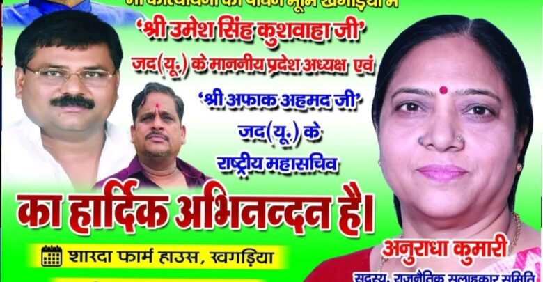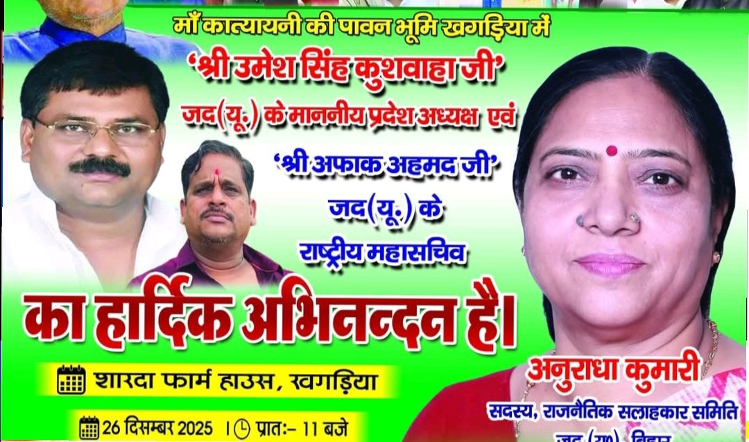 कल 26 दिसंबर को: मां कात्यायनी की धरती पर जदयू प्रदेश अध्यक्ष और महासचिव का होगा भव्य जोरदार स्वागत – अनुराधा