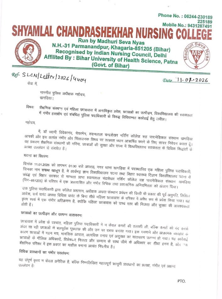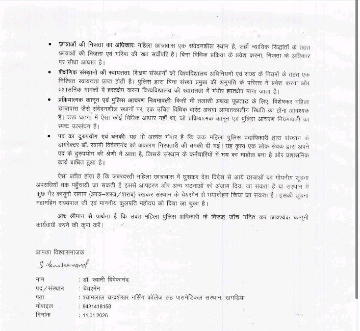 प्रेस वार्ता में यह भी बताया गया कि संस्थान के चेयरमैन डॉ. स्वामी विवेकानंद द्वारा इस पूरे मामले को लेकर पुलिस अधीक्षक, खगड़िया को विस्तृत लिखित शिकायत पत्र सौंपा गया है। पत्र में उल्लेख किया गया है कि महिला छात्रावास जैसे संवेदनशील परिसर में बिना वारंट या आपातकालीन स्थिति के प्रवेश करना छात्राओं की निजता और गरिमा के मौलिक अधिकार का सीधा उल्लंघन है। शैक्षणिक संस्थानों को विश्वविद्यालय अधिनियम एवं राज्य नियमों के अंतर्गत एक निश्चित स्वायत्तता प्राप्त है, जिसमें बिना संस्थान प्रमुख की अनुमति पुलिस हस्तक्षेप गंभीर प्रशासनिक अतिक्रमण माना जाता है। तलाशी अथवा पूछताछ के लिए विधिक वारंट अथवा स्पष्ट कानूनी आधार का अभाव प्रक्रियात्मक कानून एवं पुलिस आचरण नियमावली का उल्लंघन है। संबंधित महिला पुलिस पदाधिकारी द्वारा संस्थान के निदेशक को कथित रूप से गिरफ्तारी की धमकी देना पद के दुरुपयोग की श्रेणी में आता है, जिससे कर्मचारियों में भय का माहौल बना और प्रशासनिक कार्य बाधित हुआ। पत्र में यह आशंका भी व्यक्त की गई है कि जबरन छात्रावास में प्रवेश कर देश-विदेश से आई छात्राओं की गोपनीय जानकारी असामाजिक तत्वों तक पहुँच सकती है, जिससे अपहरण या अन्य गंभीर अपराधों की संभावना से इनकार नहीं किया जा सकता। साथ ही, यह भी कहा गया कि इस तरह की कार्रवाई से पुलिस विभाग की छवि को भी नुकसान पहुँचा है।