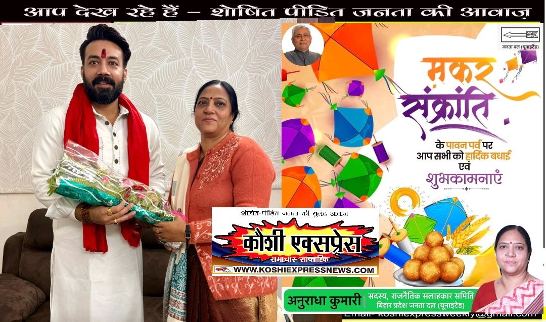 अनुराधा कुमारी कुशवाहा ने कहा कि मकर संक्रांति सामाजिक समरसता, सद्भाव और नई ऊर्जा का संदेश देने वाला पर्व है। उन्होंने आशा व्यक्त की कि नव वर्ष में सांसद राजेश वर्मा के नेतृत्व में खगड़िया लोकसभा क्षेत्र विकास के नए आयाम स्थापित करेगा और जनकल्याणकारी योजनाओं का लाभ अंतिम पंक्ति के व्यक्ति तक पहुंचेगा।
