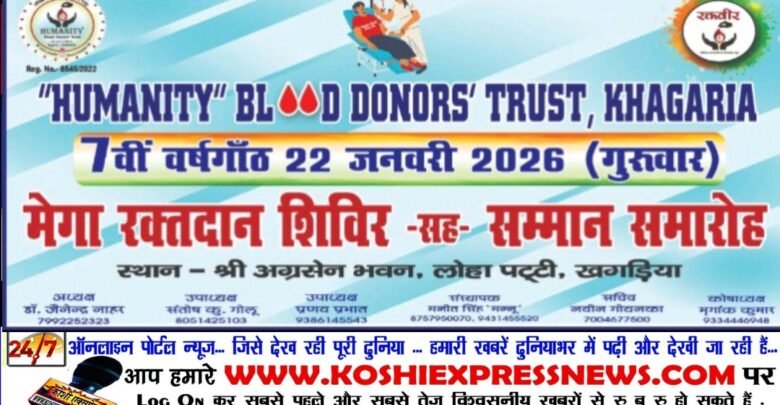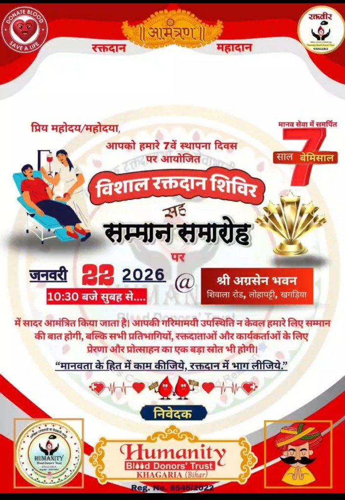 खगड़िया में मानवता का महायज्ञ: 22 जनवरी को ह्यूमैनिटी ब्लड डोनर्स ट्रस्ट की 7वीं वर्षगांठ पर विशाल रक्तदान शिविर सह सम्मान समारोह का होगा भव्य आयोजन.