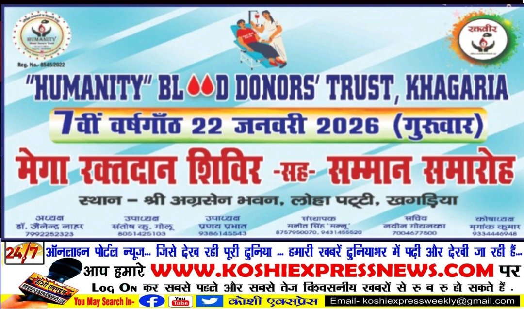 खगड़िया में मानवता का महायज्ञ: 22 जनवरी को ह्यूमैनिटी ब्लड डोनर्स ट्रस्ट की 7वीं वर्षगांठ पर विशाल रक्तदान शिविर सह सम्मान समारोह का होगा भव्य आयोजन...खगड़िया/ कौशी एक्सप्रेस/ समाजसेवा के क्षेत्र में समर्पित “ह्यूमैनिटी ब्लड डोनर्स ट्रस्ट, खगड़िया” अपने स्थापना के 7वें वर्षगांठ के अवसर पर 22 जनवरी 2026 (गुरुवार) को मेगा रक्तदान शिविर सह सम्मान समारोह का भव्य आयोजन करने जा रहा है। यह कार्यक्रम श्री अग्रसेन भवन, लोहा पट्टी, खगड़िया में संपन्न होगा।
