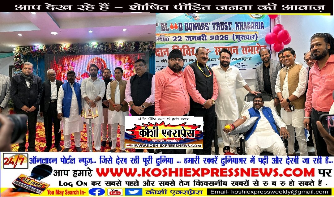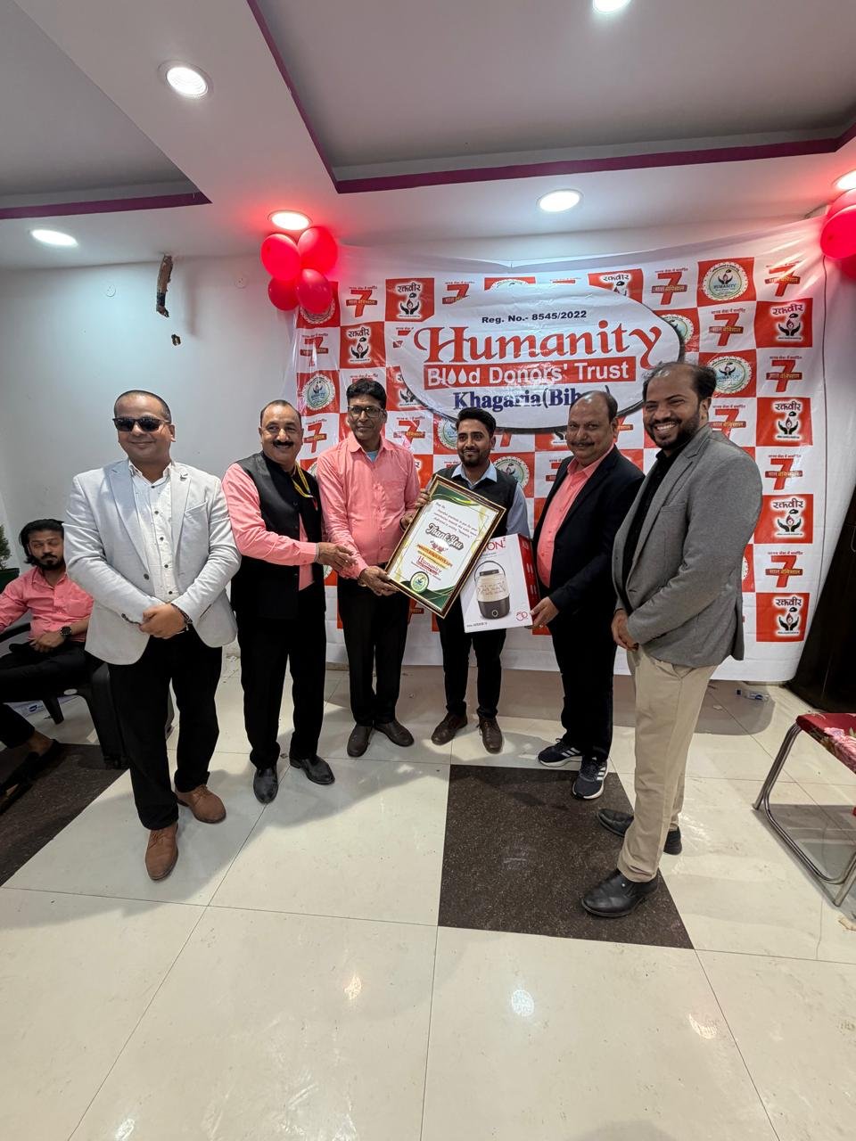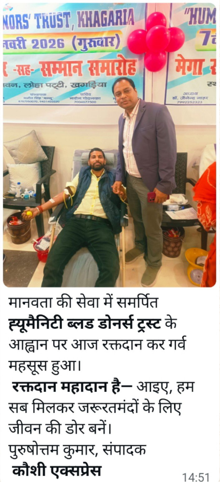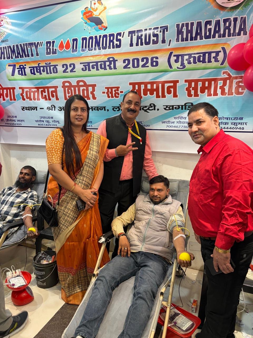 खगड़िया/ कौशी एक्सप्रेस/ आज पूर्व निर्धारित कार्यक्रम तहत अग्रसेन भवन में ह्यूमैनिटी ब्लड डोनर्स ट्रस्ट की 7वीं वर्षगांठ के अवसर पर आयोजित मेगा रक्तदान शिविर ने मानवता, सेवा और संवेदनशीलता की अद्भुत मिसाल पेश की। शिविर में निर्धारित 75 यूनिट रक्तदान के लक्ष्य के मुकाबले 172 यूनिट रक्त संग्रह कर एक नया रिकॉर्ड कायम किया गया।