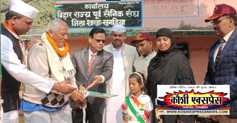 खगड़िया/ कौशी एक्सप्रेस/ 26 जनवरी 2026 को पूर्व सैनिक संघ कार्यालय खगड़िया में 77वें गणतंत्र दिवस के अवसर पर भव्य एवं गरिमामय ध्वजारोहण कार्यक्रम का आयोजन किया गया। कार्यक्रम में देश की सेवा कर चुके पूर्व सैनिकों तथा शहीद की पत्नी वीर नारी को विशेष रूप से सम्मानित किया गया।