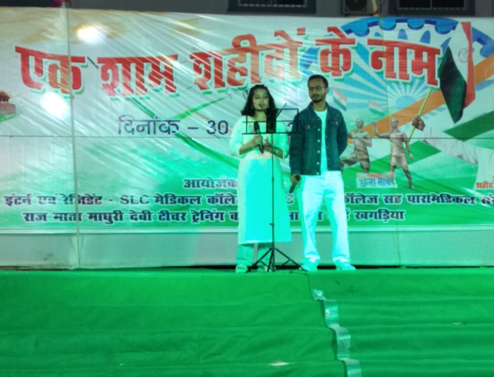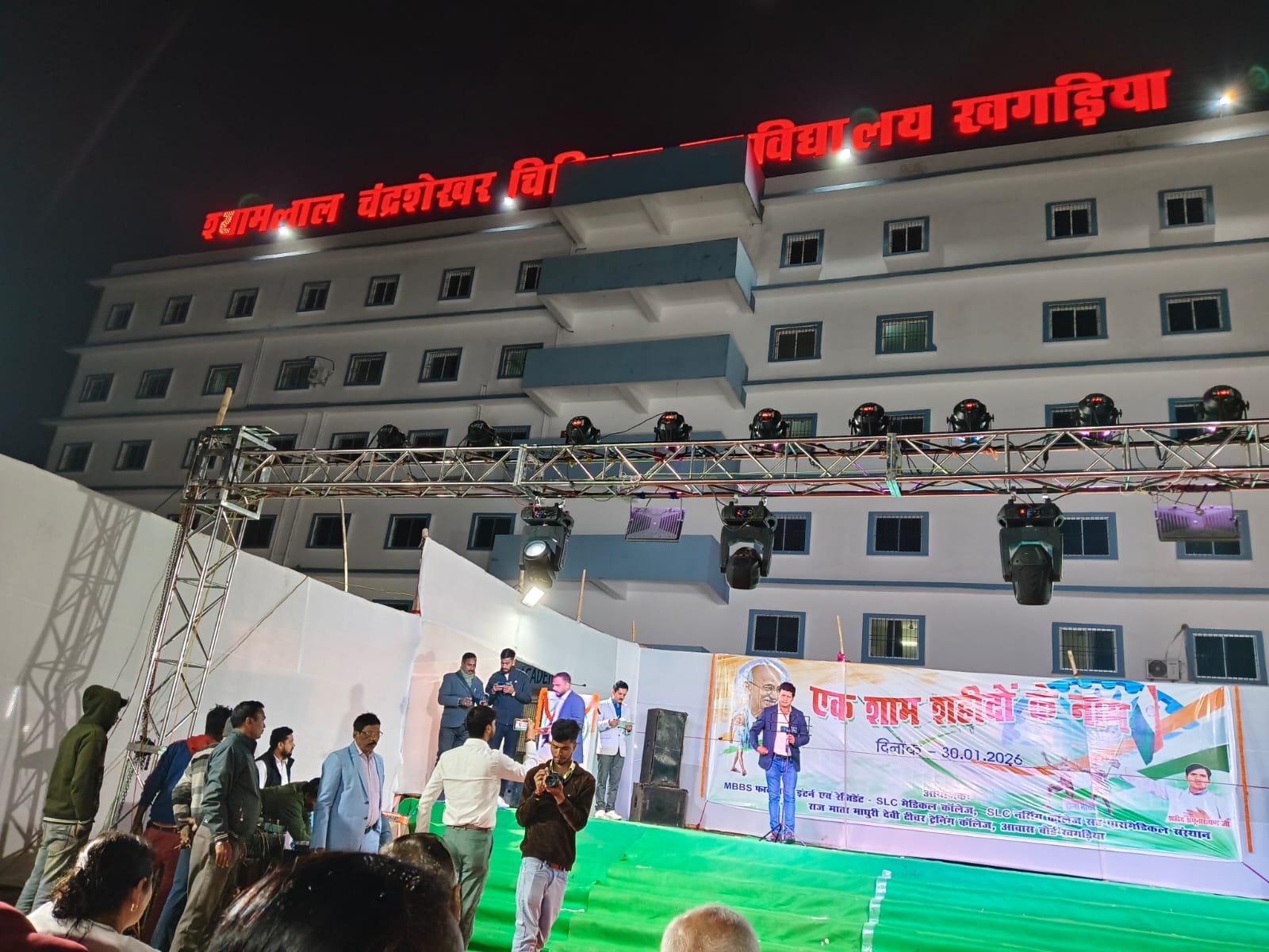 खगड़िया/ कौशी एक्सप्रेस/शुक्रवार 30 जनवरी को श्यामलाल चंद्रशेखर मेडिकल कॉलेज एवं शहीद प्रभुनारायण मल्टीस्पेशलिटी अस्पताल परिसर में राष्ट्रपिता महात्मा गांधी के शहादत दिवस के अवसर पर दीप प्रज्ज्वलन के साथ एक शाम शहीदों के नाम श्रद्धांजलि कार्यक्रम का शुभारंभ किया गया। कार्यक्रम का उद्देश्य देश की आज़ादी के लिए अपने प्राण न्यौछावर करने वाले अमर शहीदों को नमन करना एवं नई पीढ़ी में राष्ट्रभक्ति की भावना को सुदृढ़ करना था।