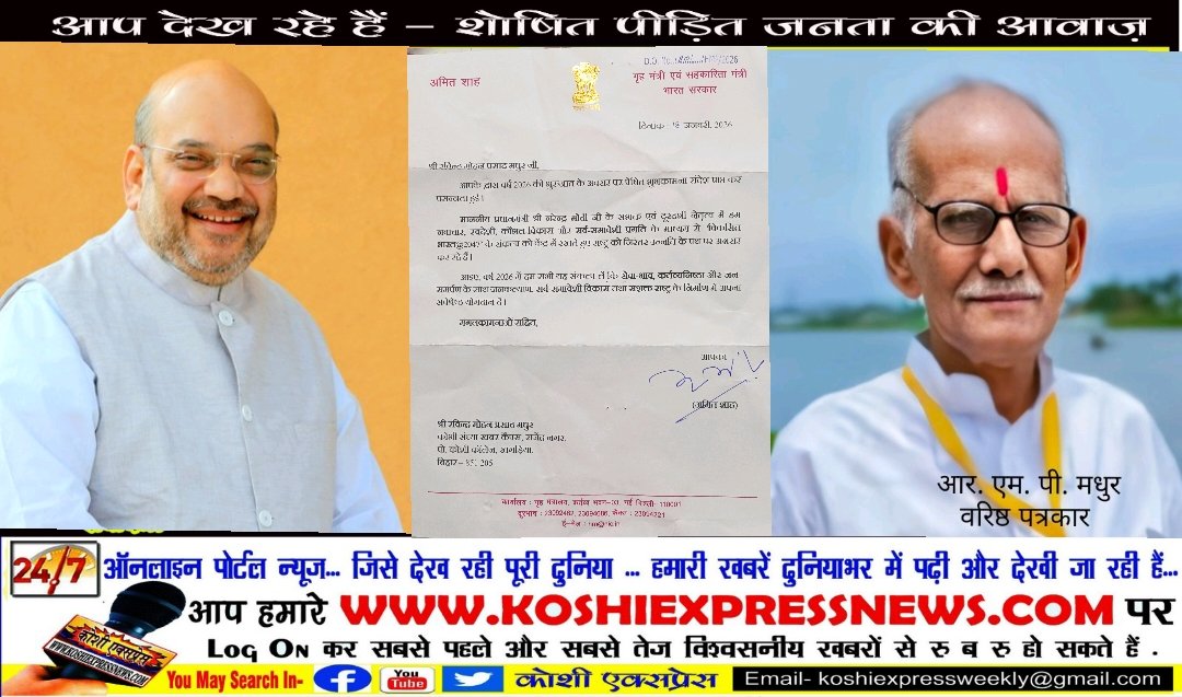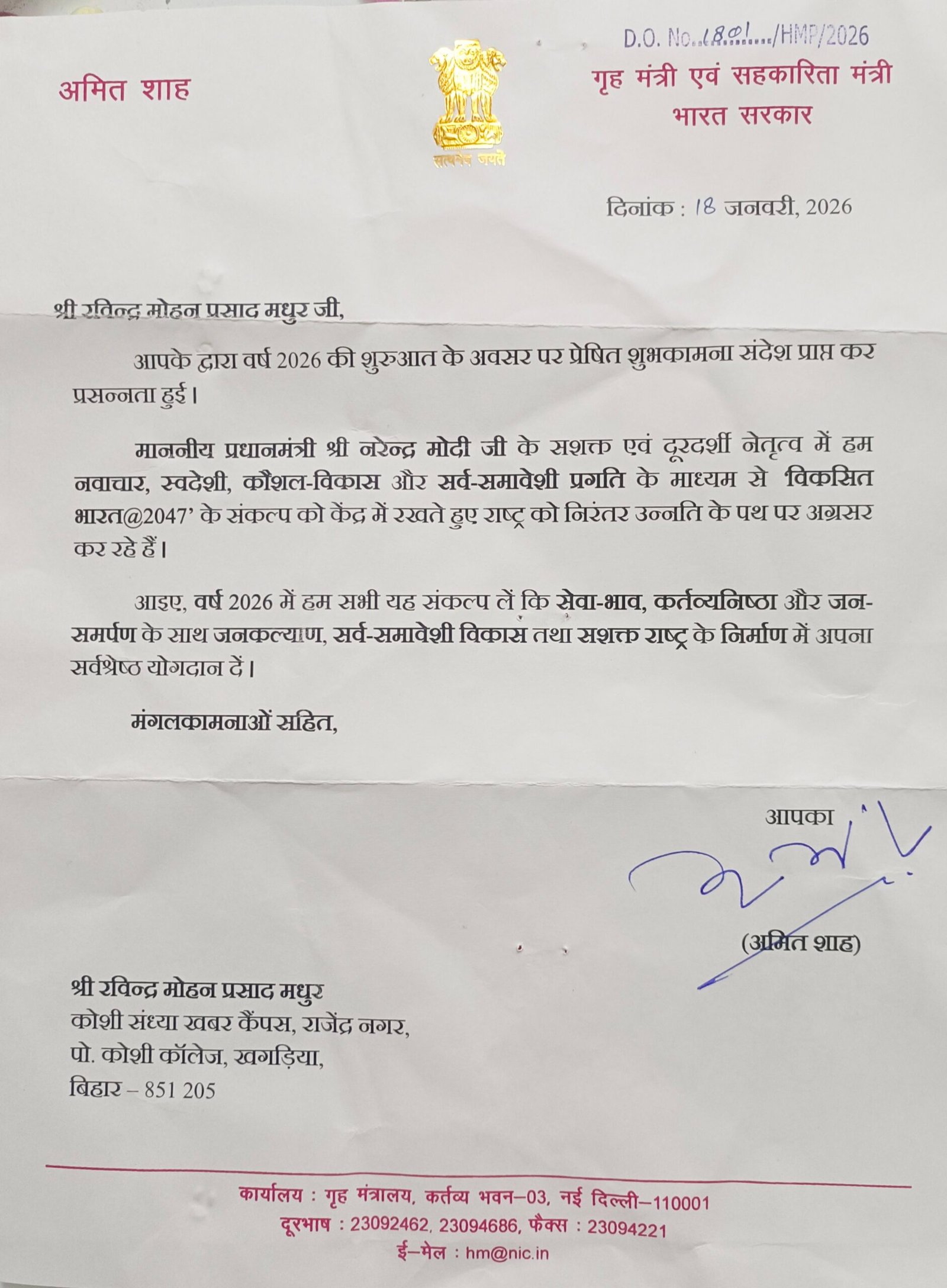 खगड़िया/ कौशी एक्सप्रेस/ केंद्रीय गृह मंत्री एवं सहकारिता मंत्री श्री अमित शाह ने नववर्ष 2026 के अवसर पर खगड़िया के वरिष्ठ पत्रकार एवं कोशी संध्या खबर , कौशी एक्सप्रेस के संस्थापक श्री रविंद्र मोहन प्रसाद मधुर को शुभकामना संदेश भेजा है।