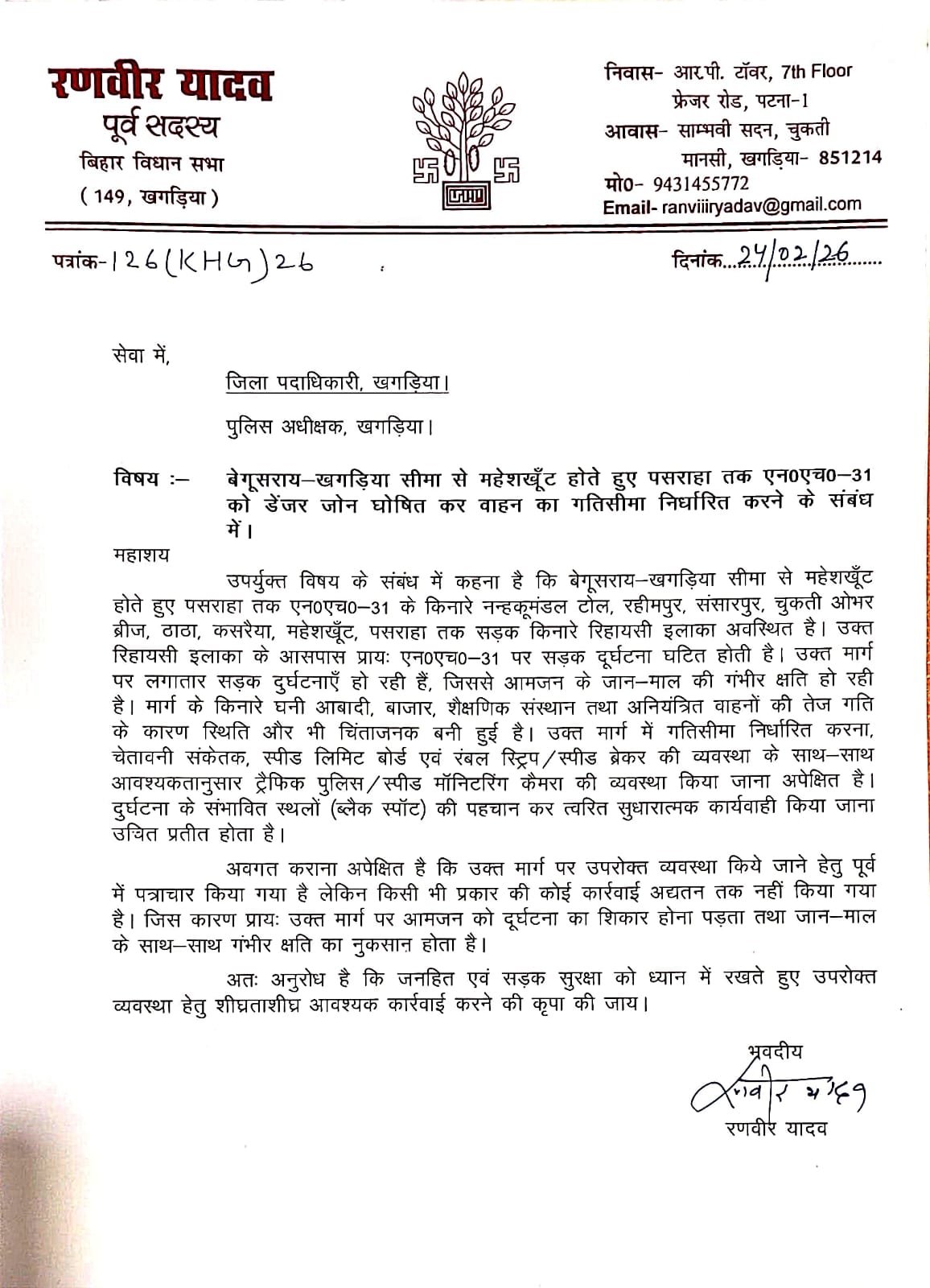 खगड़िया/ कौशी एक्सप्रेस/ राष्ट्रीय राजमार्ग–31 पर निरंतर हो रही सड़क दुर्घटनाओं को गंभीरता से लेते हुए पूर्व विधायक रणवीर यादव ने जिला पदाधिकारी एवं पुलिस अधीक्षक, खगड़िया को पत्र प्रेषित कर बेगूसराय–खगड़िया सीमा से महेशखूँट होते हुए पसराहा तक के मार्गखंड को “डेंजर जोन” घोषित करने तथा वाहनों की अधिकतम गति सीमा विधिवत निर्धारित कर अनुपालन सुनिश्चित कराने की मांग की है। अपने पत्र में पूर्व विधायक ने उल्लेख किया है कि उक्त मार्ग खंड के किनारे नन्हकू मंडल टोल, रहीमपुर, संसारपुर, चुकती ओवरब्रिज, ठाठा, कसरैया, महेशखूँट एवं पसराहा सहित कई घनी आबादी वाले रिहायसी क्षेत्र अवस्थित हैं। सड़क के दोनों ओर बाजार, शैक्षणिक संस्थान एवं अन्य सार्वजनिक प्रतिष्ठान होने के कारण दिनभर भारी आवागमन बना रहता है। इसके बावजूद अनियंत्रित एवं तेज रफ्तार वाहनों के परिचालन से बार-बार दुर्घटनाएं घटित हो रही हैं, जिसके परिणामस्वरूप आम नागरिकों की असामयिक मृत्यु एवं गंभीर चोटें हो रही हैं।
