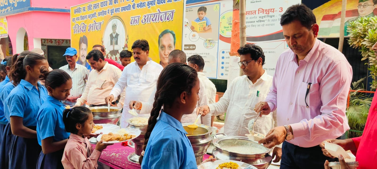 बापू मध्य विद्यालय के प्रधानाध्यापक चंद्रमणि मिश्रा ने बताया कि विद्यालय शिक्षा समिति के अनुरोध पर मनोहर कुमार यादव ने अपने पिता की पुण्यतिथि के अवसर पर तिथि भोज का आयोजन कराया। उन्होंने कहा कि शिक्षा विभाग के निर्देशानुसार बच्चों को पोषणयुक्त भोजन उपलब्ध कराने के लिए विशेष तिथियों पर तिथि भोज का आयोजन किया जाता है।