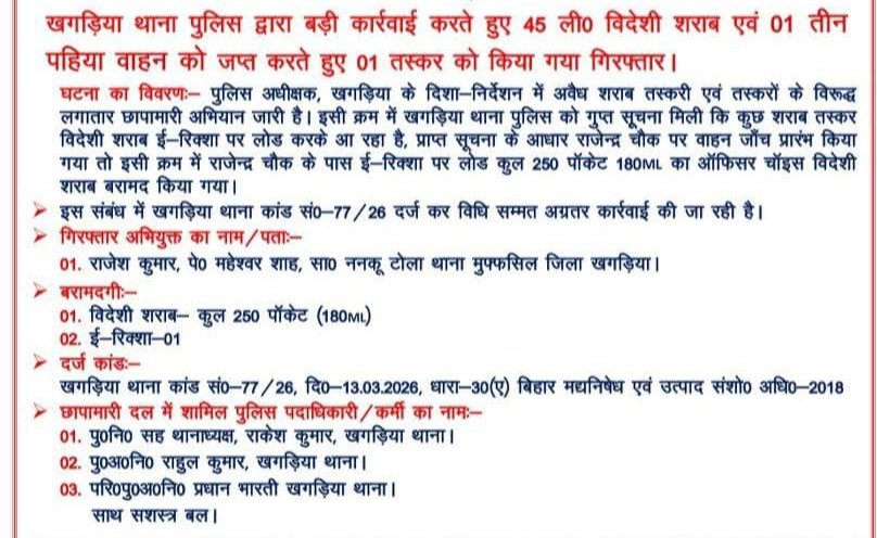 खगड़िया नगर थानाध्यक्ष राकेश कुमार गुप्ता की कार्रवाई…टोटो से 45 लीटर विदेशी शराब बरामद, एक गिरफ्तार