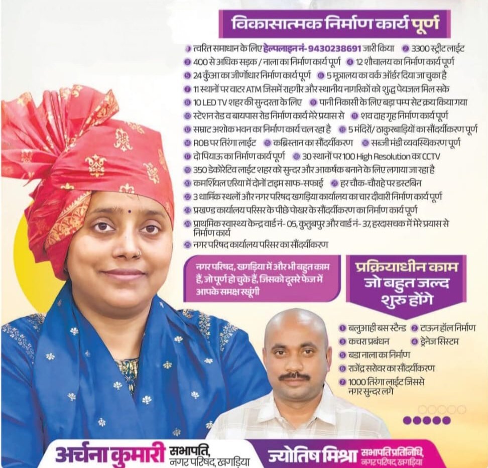 उन्होंने कहा कि नगर परिषद खगड़िया में अभी और भी कई कार्य पूरे हो चुके हैं, जिन्हें दूसरे चरण में जनता के सामने रखा जाएगा। उनका उद्देश्य खगड़िया शहर को स्वच्छ, सुंदर और विकसित शहर के रूप में स्थापित करना है। “नगर सभापति अर्चना कुमारी और सभापति प्रतिनिधि ज्योतिष मिश्रा ने संयुक्त रूप से कहा कि नगर परिषद की पूरी टीम, वार्ड पार्षदों और आम नागरिकों के सहयोग से “स्वच्छ खगड़िया, सुंदर खगड़िया” के संकल्प को साकार करने की दिशा में लगातार कार्य किया जा रहा है। उन्होंने कहा कि शहर के विकास, स्वच्छता और सौंदर्यीकरण को लेकर नगर परिषद पूरी प्रतिबद्धता के साथ काम कर रही है और आगे भी कई महत्वपूर्ण योजनाओं को धरातल पर उतारा जाएगा।”