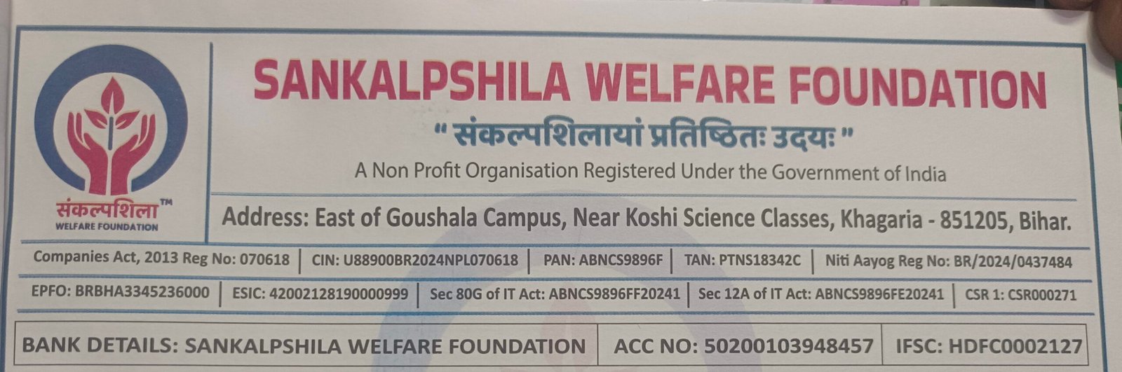 जानकारी के अनुसार वर्ष 2024 में स्थापित संकल्पशिला वेलफेयर फाउंडेशन भारत सरकार के अधीन पंजीकृत एक नॉन प्रॉफिट ऑर्गेनाइजेशन है। संस्था का कार्यालय गौशाला कैंपस के पूर्व, कोशी साइंस क्लासेस के निकट, खगड़िया में स्थित है।