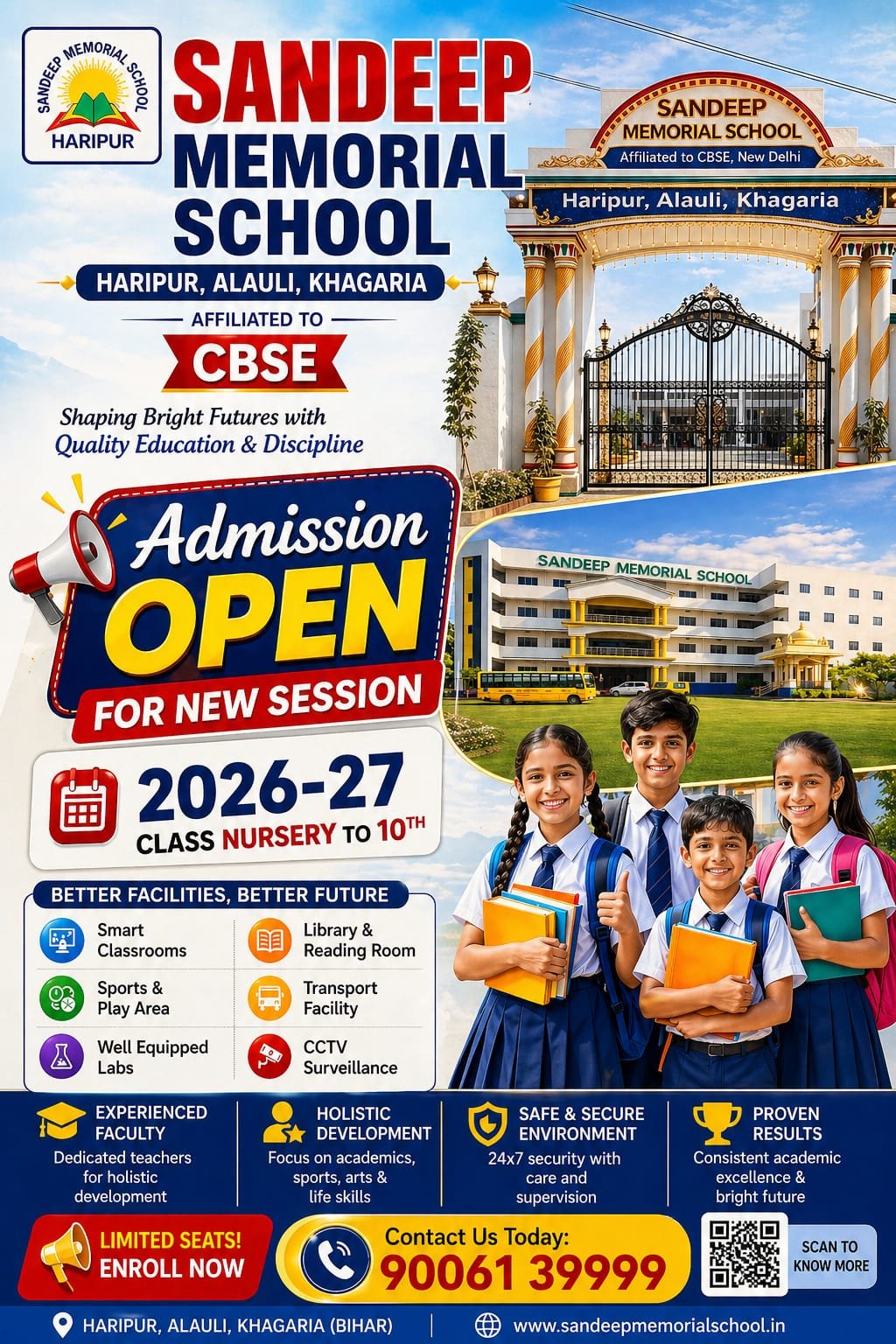प्राचार्य के. एम. झा ने बताया कि विद्यालय में नए शैक्षणिक सत्र 2026-27 के लिए नर्सरी से 10वीं कक्षा तक नामांकन प्रक्रिया शुरू कर दी गई है। विद्यालय में CBSE पाठ्यक्रम के अनुसार पढ़ाई कराई जाएगी, जिससे ग्रामीण क्षेत्र के बच्चों को बेहतर शिक्षा का अवसर अपने ही क्षेत्र में उपलब्ध हो सकेगा। उन्होंने कहा कि विद्यालय में स्मार्ट क्लासरूम, सुसज्जित प्रयोगशाला, पुस्तकालय, खेल मैदान, परिवहन सुविधा एवं सीसीटीवी निगरानी जैसी आधुनिक व्यवस्थाएं उपलब्ध हैं। बच्चों को पढ़ाई के साथ-साथ खेल, सांस्कृतिक गतिविधियों, नैतिक शिक्षा और जीवन कौशल पर भी विशेष प्रशिक्षण दिया जा रहा है। मालूम हो कि विद्यालय में छात्रों एवं अभिभावकों की सुविधा को ध्यान में रखते हुए लिफ्ट सुविधा भी उपलब्ध कराई गई है, जो इसे क्षेत्र के आधुनिक शिक्षण संस्थानों में अलग पहचान दिलाती है। वहीं विद्यालय प्रशासन ने बताया कि आगामी समय में हॉस्टल सुविधा भी जल्द प्रारंभ की जाएगी, जिससे दूर-दराज क्षेत्रों के विद्यार्थियों को बेहतर आवासीय सुविधा मिल सकेगी। प्राचार्य के. एम. झा ने कहा कि विद्यालय की प्राथमिकता बच्चों में आत्मविश्वास, नेतृत्व क्षमता और सकारात्मक सोच विकसित करना है, ताकि वे भविष्य में हर क्षेत्र में सफलता हासिल कर सकें। अनुभवी शिक्षकों की टीम विद्यार्थियों को बेहतर मार्गदर्शन देने के लिए निरंतर कार्य कर रही है। उन्होंने बताया कि हाल ही में विद्यालय को Central Board of Secondary Education (CBSE) से आधिकारिक मान्यता प्राप्त हुई है। विद्यालय को 01 अप्रैल 2026 से 31 मार्च 2031 तक के लिए एफिलिएशन दिया गया है। इससे क्षेत्र के अभिभावकों और विद्यार्थियों में खुशी का माहौल है। प्राचार्य ने अभिभावकों से अपील की कि वे समय रहते अपने बच्चों का नामांकन कराएं और उन्हें बेहतर शिक्षा का अवसर दें। नामांकन से संबंधित जानकारी के लिए विद्यालय के हेल्पलाइन नंबर 90061 39999 पर संपर्क किया जा सकता है।