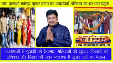 खगड़िया : 149 विस: जाप प्रत्याशी मनोहर कुमार यादव का जनसंपर्क अभियान घर-घर तक पहुंचा… जनसभाओं में युवाओं को रोजगार, महिलाओं को सुरक्षा, किसानों को अधिकार और बिहार की लचर व्यवस्था में सुधार लाने का ऐलान..