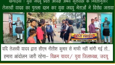 खगड़िया : युवा जदयू प्रदेश अध्यक्ष अभय कुशवाहा के निर्देशानुसार तेजस्वी यादव का पुतला दहन कर युवा जदयू नेताओं ने विरोध जताया … यदि तेजस्वी यादव द्वारा सीएम नीतीश कुमार से माफी नहीं मांगी गई तो हमारा आंदोलन जारी रहेगा- विक्रम यादव/ युवा जिलाध्यक्ष, जदयू