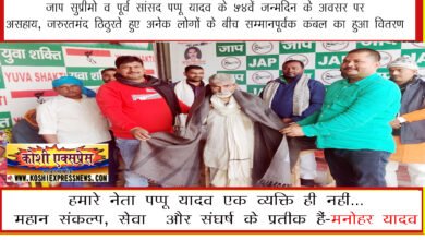 खगड़िया: जाप सुप्रीमो व पूर्व सांसद पप्पू यादव के 54वें जन्मदिन के अवसर पर असहाय, जरुरतमंद ठिठुरते हुए अनेक लोगों के बीच सम्मानपूर्वक कंबल का हुआ वितरण… हमारे नेता पप्पू यादव एक व्यक्ति ही नहीं… महान संकल्प, सेवा और संघर्ष के प्रतीक हैं-मनोहर यादव