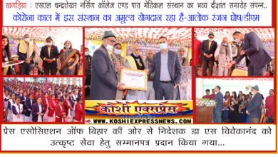 खगड़िया: एसएल चन्द्रशेखर नर्सिग काॅलेज एण्ड पारा मेडिकल संस्थान का भव्य दीक्षांत समारोह संपन्न… कोरोना काल में इस संस्थान का अमूल्य योगदान रहा है-आलोक रंजन घोष/ DM… प्रेस एसोसिएशन ऑफ बिहार की ओर से निदेशक डा एस विवेकानंद को उत्कृष्ट सेवा हेतु सम्मानपत्र प्रदान किया गया..