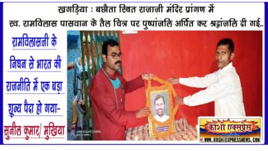 खगड़िया: बछौता स्थित राजाजी मंदिर प्रांगण में स्व. रामविलास पासवान के तैल चित्र पर पुष्पांजलि अर्पित कर श्रद्धांजलि दी गई… रामविलास पासवानजी के निधन से भारत की राजनीति में एक बड़ा शून्य पैदा हो गया- सुनील कुमार/ मुखिया