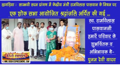 खगड़िया: साम्भवी सदन प्रांगण में केन्द्रीय मंत्रीे रामविलास पासवान के निधन पर एक शोक सभा आयोजित कर श्रद्धांजलि अर्पित की गई … . स्व. रामविलास पासवानजी हमारें परिवार के शुभचिंतक व अभिभावक थे- पूनम देवी यादव